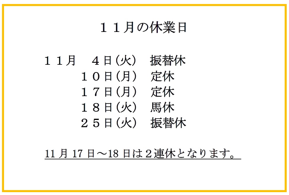 informationお知らせ 2025.10.31 11月休みのお知らせ 日本馬術連盟・全国乗馬倶楽部振興協会加盟 優良乗馬施設認定乗馬クラブ ヨシザワライディングファーム(有限会社ヨシザワ) 〒300-0525 茨城県稲敷市羽賀2412-1 [お問い合わせ] TEL 029-892-7321 月曜日定休(祝日の場合は、翌火曜日が定休) ※月1回程度、不定期で火曜日がお休みとなります。